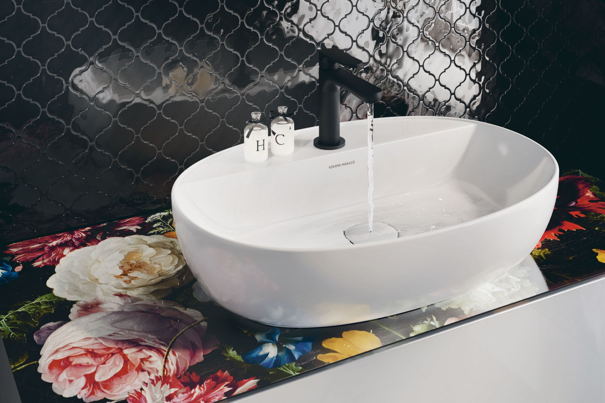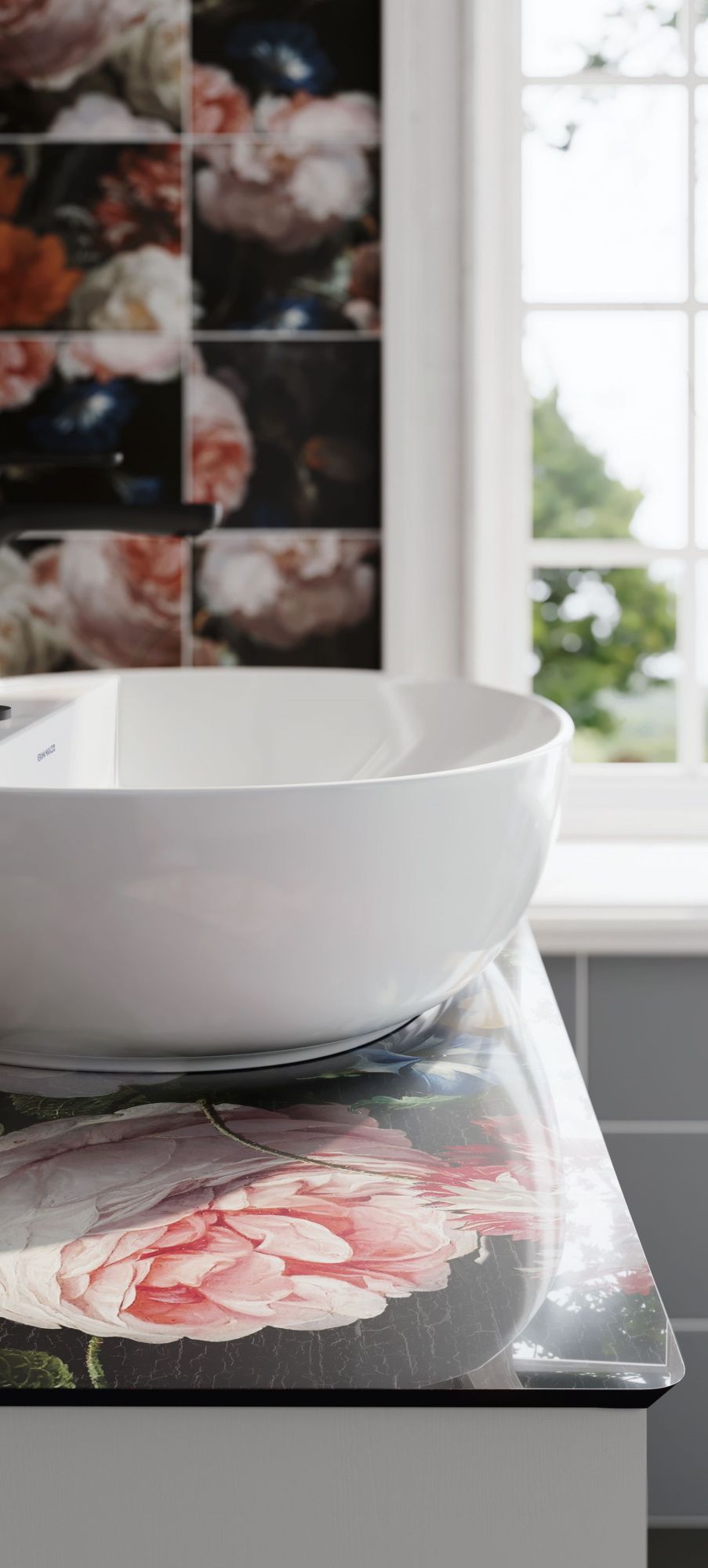 Пожалуй, вы нигде не найдете такого разнообразия столешниц под раковину, как в серии Плаза Модерн. Приобретая тумбу любого размера и конфигурации, можно выбрать один из семи вариантов керамических столешниц, которые воспроизводят различные материалы: мрамор, камень, бетон. Или остановить свой выбор на нарядной столешнице «Парк роз», где текстура холста реалистично передана с помощью доработки поверхности специальным составом.