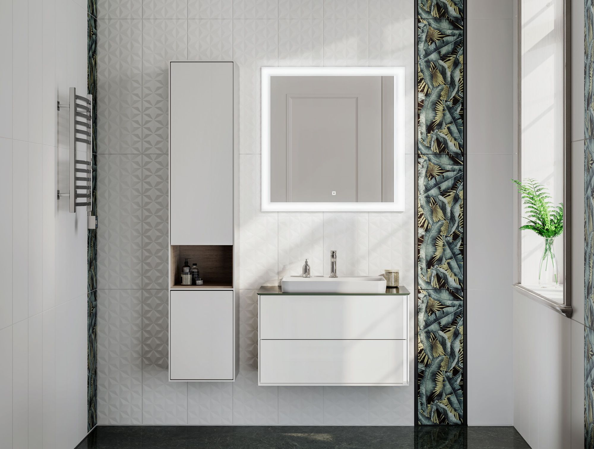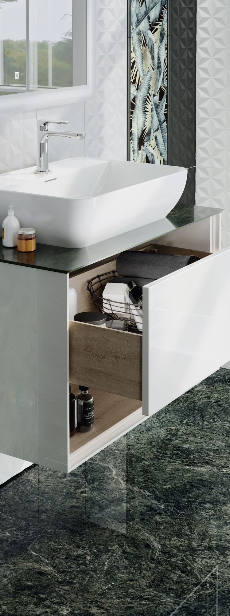 Серия предлагает дизайнерские комбинации «тумба + раковина + столешница», которые можно дополнить подвесным пеналом, безободковым унитазом и биде. Компактная конструкция подвесного унитаза без бачка и биде, имеющего точно такую же форму и аналогичные габариты, позволяют сэкономить пространство. Даже когда в интерьере используются все элементы серии, обстановка не выглядит перегруженной благодаря светлым глянцевым фасадам, на которых нет никаких ручек и рисунков. Только чистый геометрический дизайн.