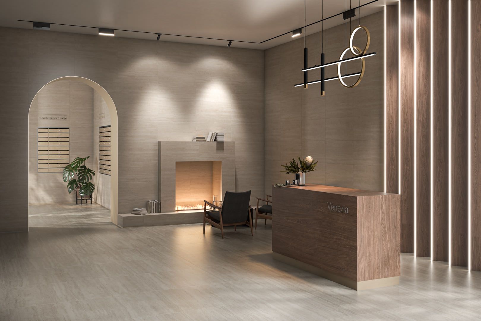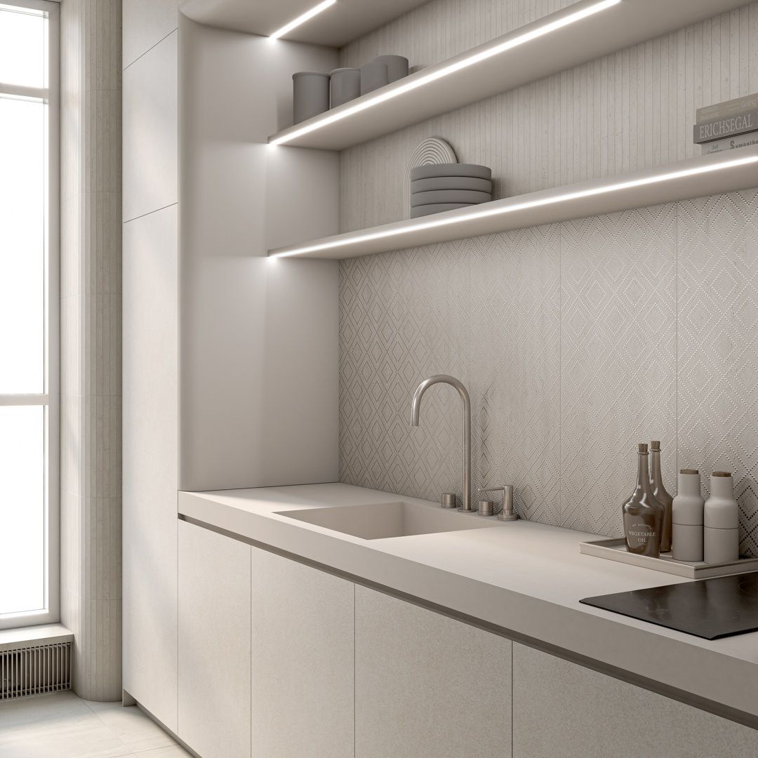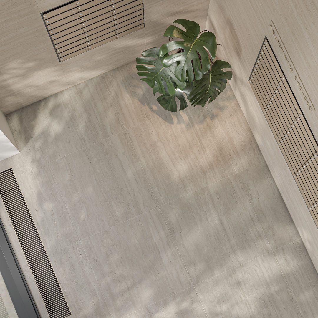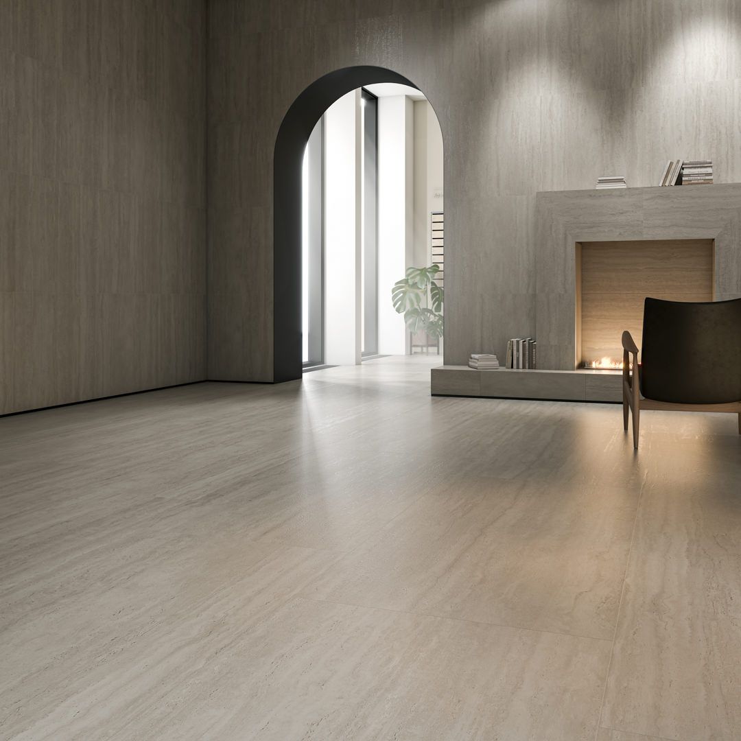 Серия «Сан-Марко» воспроизводит красоту травертина, предлагая природные текстуры и геометрические узоры в натуральных оттенках. Фоновая плитка 40х80 выполнена со структурой камня.