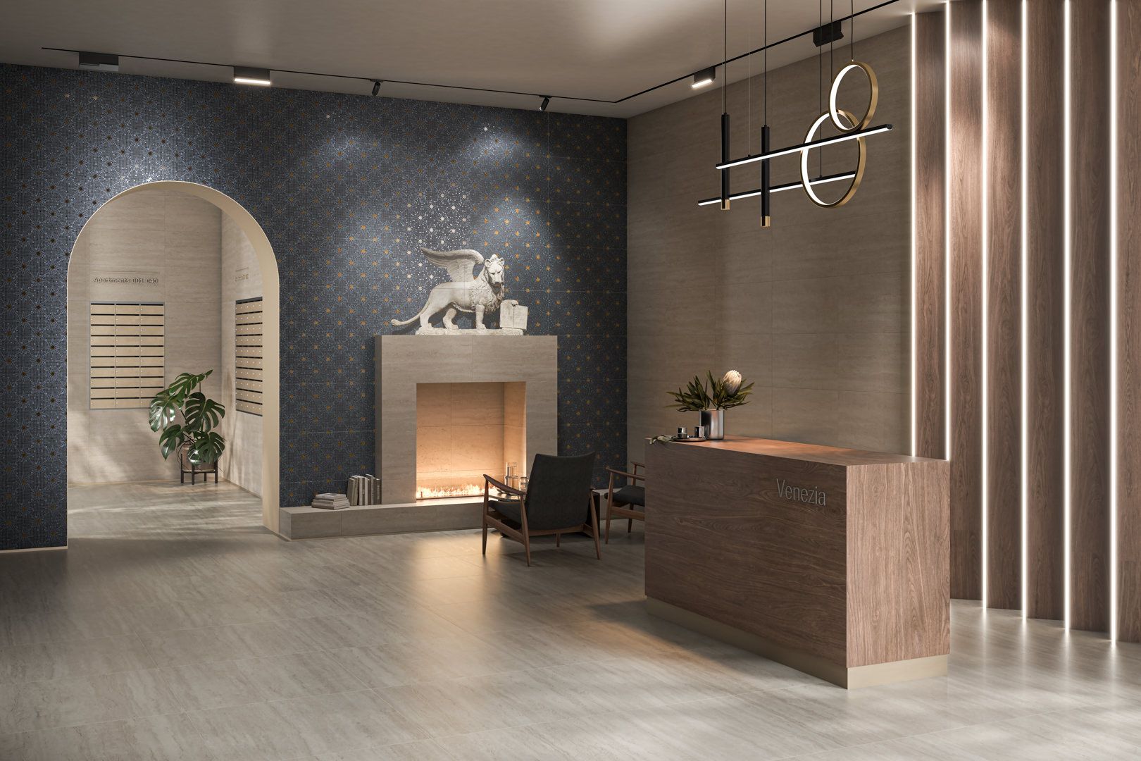 Декоративные решения «Сан-Марко» примечательны необычным панно из четырёх частей. На панно из плитки в стилистике венецианской мозаики представлен крылатый лев с открытой книгой — символ Святого Марка, небесного покровителя Венеции. Наличие отдельного артикула с изображением звёздного неба позволяет расширить композицию на нужную площадь, создав заметный интерьерный акцент.