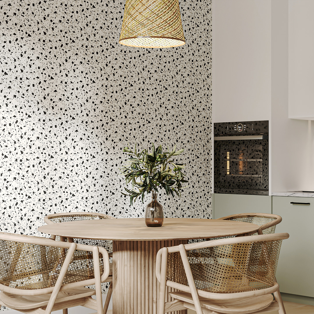 Обои «Семинато» предлагают свежий взгляд на эстетику терраццо — каменной мозаики, известной ещё с античных времён. В серии предложены два интересных подхода к рисунку терраццо. Первый заметен на фоновых однотонных обоях, где структура мозаичного покрытия с крупными вкраплениями передана тиснением. Второй вариант с контрастным сочетанием цветов реализован в мотивах.